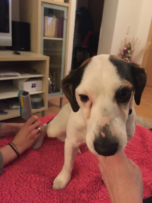 6-jährige Jack-Russell-Hündin chronisch tränenden Augen. Bisherige Behandlungen mit verschiedenen Tropfen vom Tierarzt fehlgeschlagen.